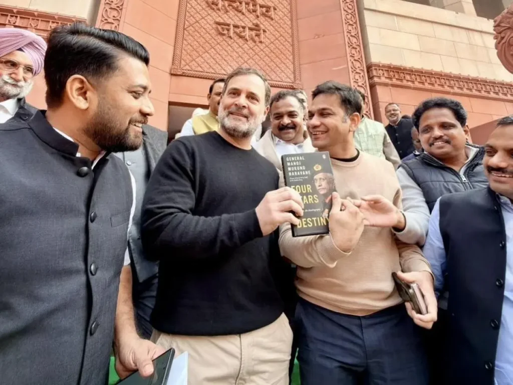 ಸಂಸತ್ ಹೊರಗೆ ನರವಾಣೆ ಆತ್ಮಚರಿತ್ರೆ ಪ್ರದರ್ಶಿಸಿದ ರಾಹುಲ್ ಗಾಂಧಿ